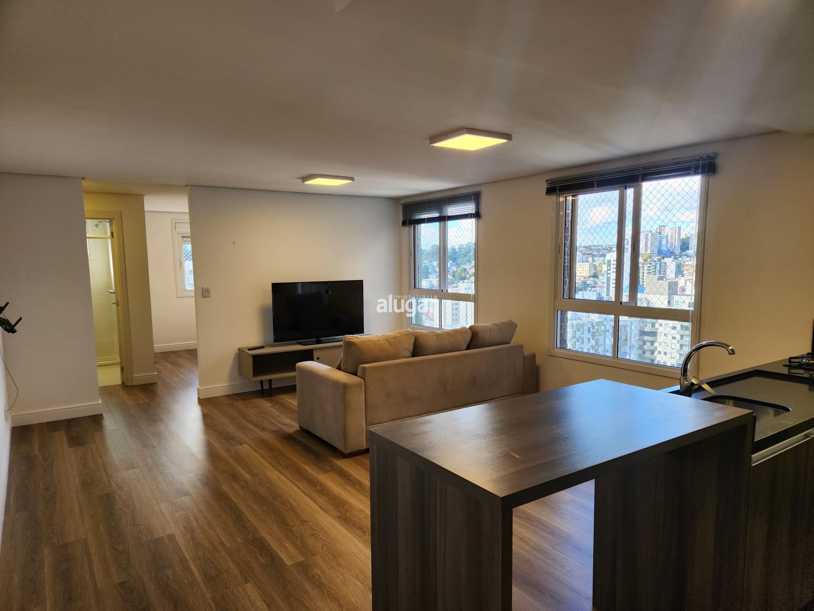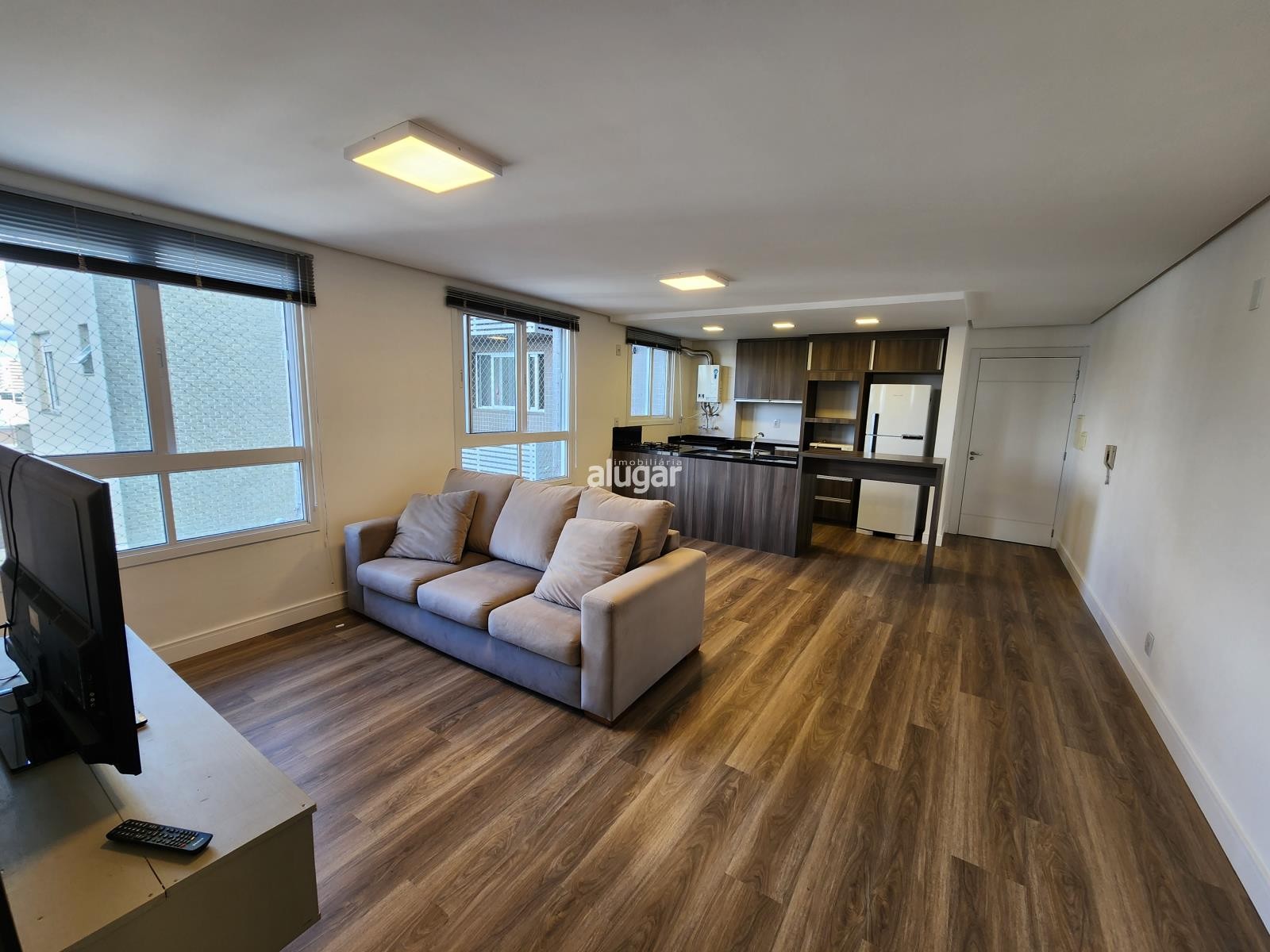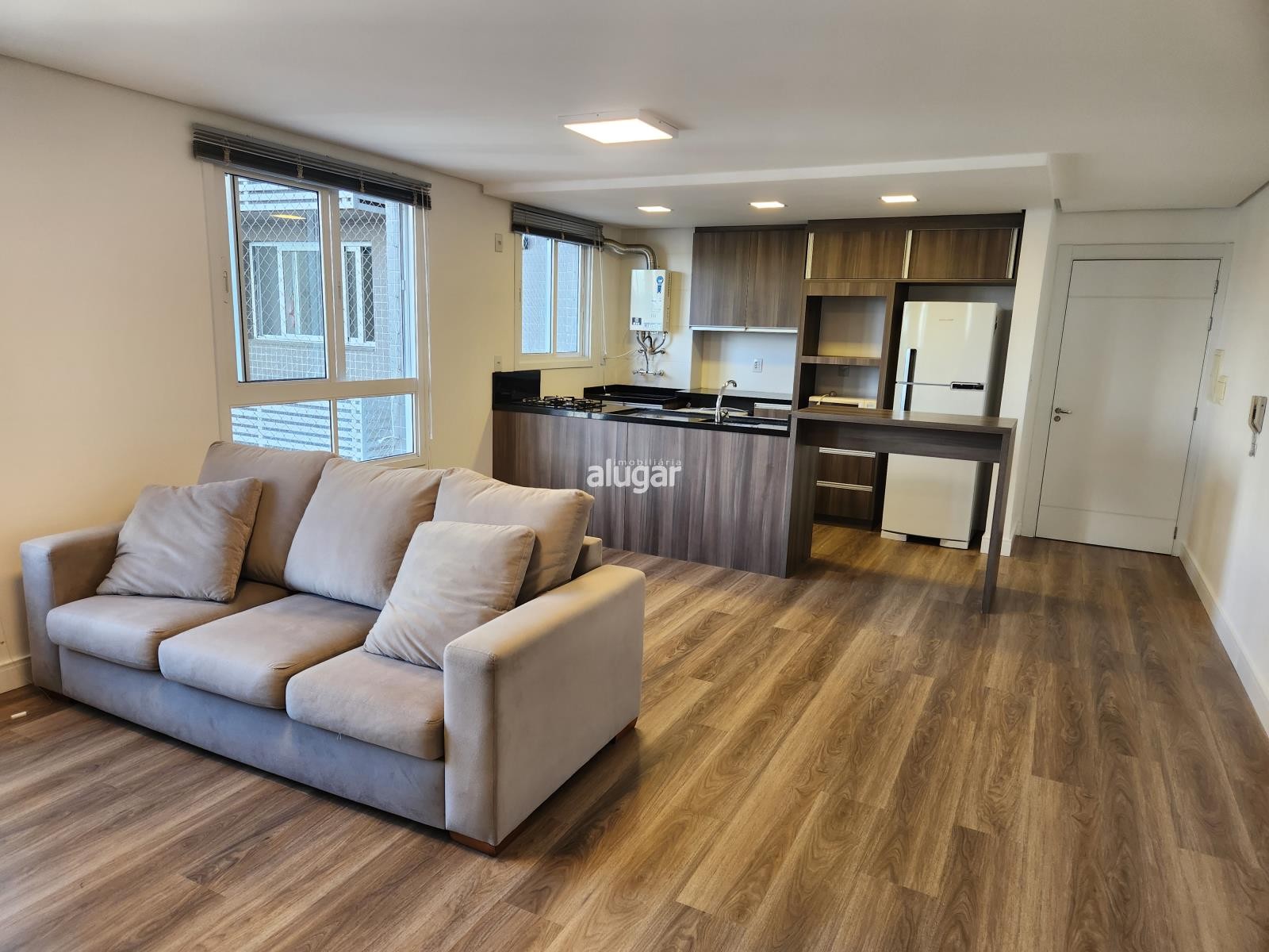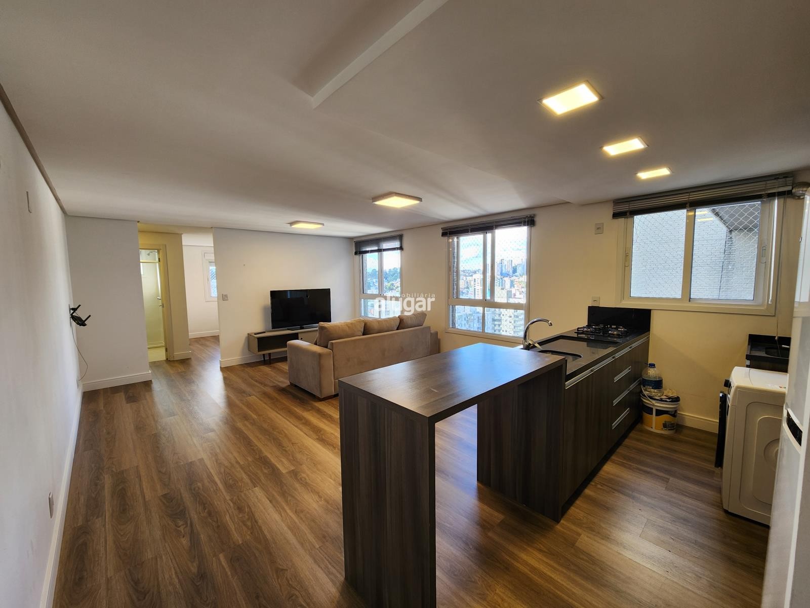 Em um ambiente totalmente integrado temos 1 dormitório, banheiro, cozinha, área de serviço e salas de estar e jantar, oferece um ambiente aconchegante perfeito para quem busca praticidade e conforto.