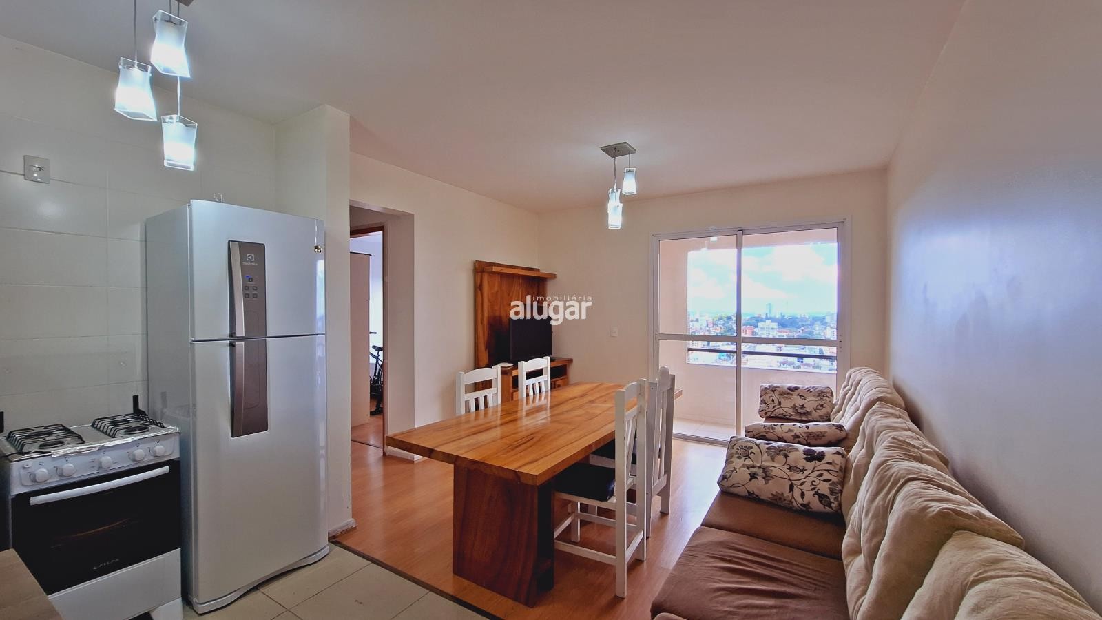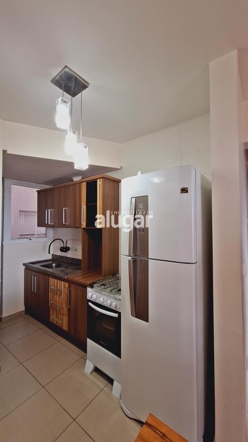 Com 63 m² de área total, ele oferece dois dormitórios, sala de estar e jantar integradas, cozinha, área de serviço, banheiro, churrasqueira, sacada e uma vaga de estacionamento.